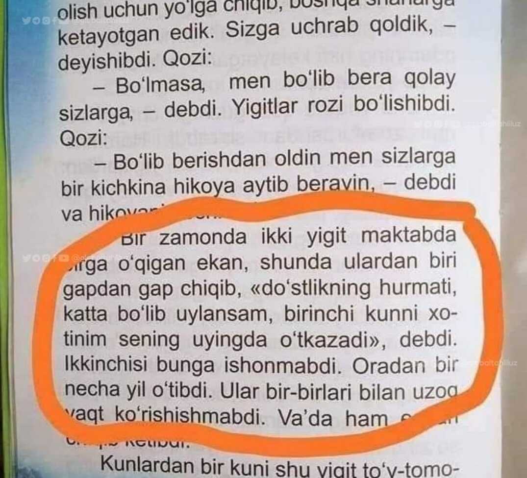 ❗️"Таълим тизимига катта эътибор қаратяпмиз", "ёшлар бизнинг келажагимиз", каби жумлаларни жуда кўп эшитганмиз. Чиндан ҳам таълим тизимига ҳар йили миллиардлаб пул сарфлаймиз, хусусан болалар тарбияси ҳақида кўп қайғурамиз, Юксак маънавият - енгилмас куч, каби шиорлардан бот-бот фойдаланимизу, аммо мана бундай ёшлар онгини заҳарловчи, миллатимиз, урф-одатимиз, динимизга зид бўлган қарашларни дарсликларга жойлашларини ҳазм қилиш қийин...Масъуллар қаерга қарамоқда, маҳалла, телевидение-чи !?