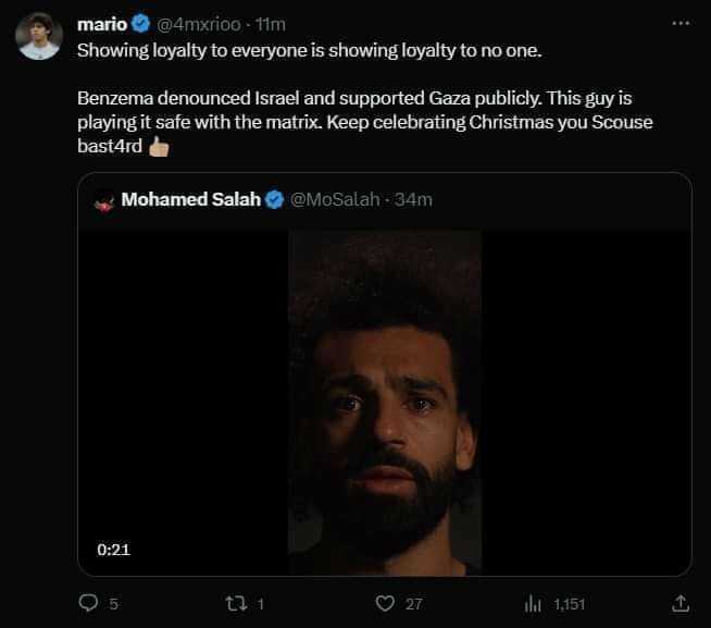 اللي شايف ان صلاح أضاف حاجة أو إنه كده عمل واجبه يبقى مغيب و بيدور على أي حاجة عشان يرجع يطبل لصلاح بعد اول ماتش لليفربول ، كلام صلاح ميفرقش حاجة عن كلام الحكام بتاع ندين و نستنكر ، هو موضحش الحقيقة فين ، هو مقالش مين اللي صح و مين اللي غلط هو سابها عايمة كده و بص لمصلحته برضو .