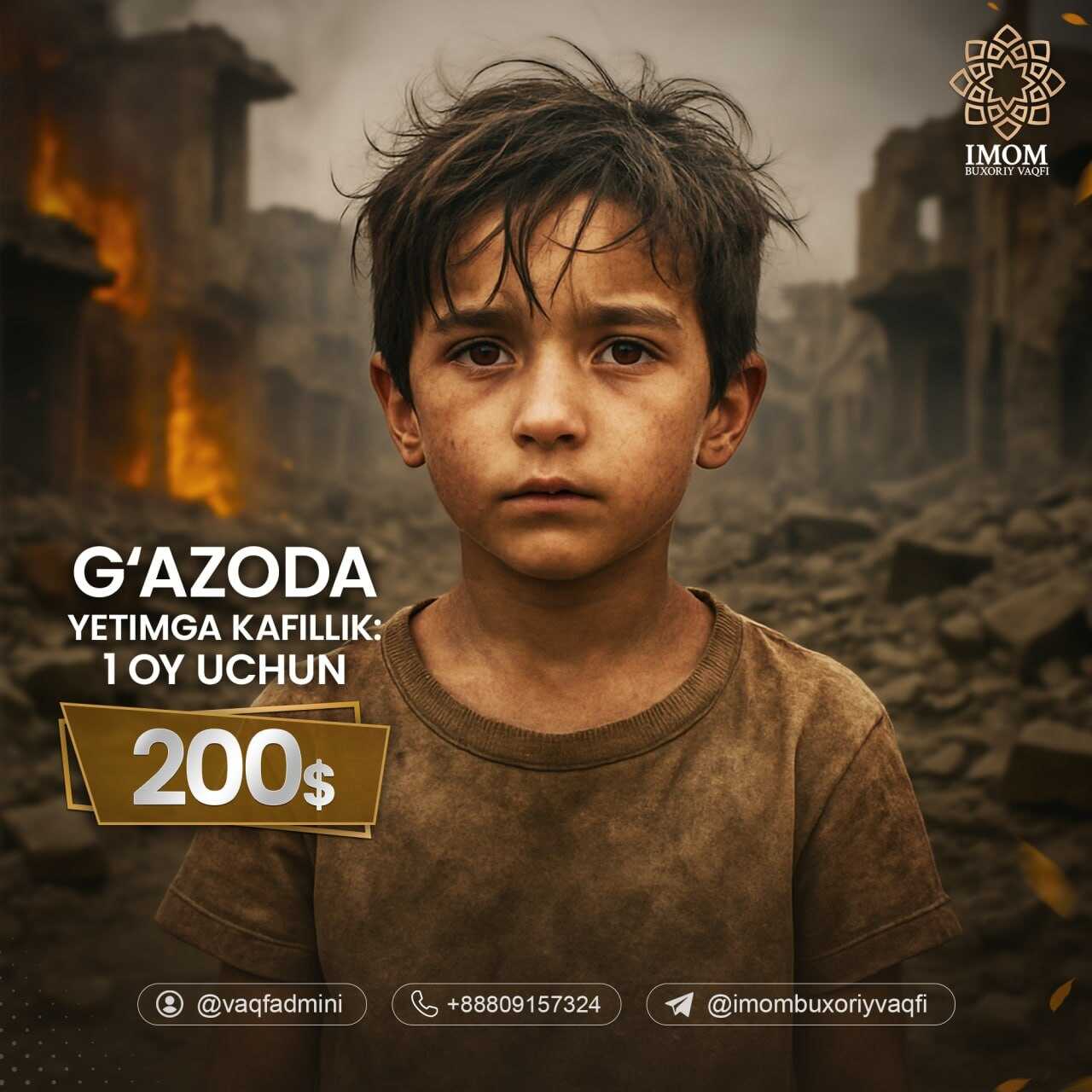 ℹ️Eslatma: G‘azodagi qimmatchilik va aholining ehtiyojlarini inobatga olgan holda, yetim bolalar uchun kafillik miqdorini har bir bola uchun oyiga 200$ etib belgilashni ma’qul ko‘rdik.