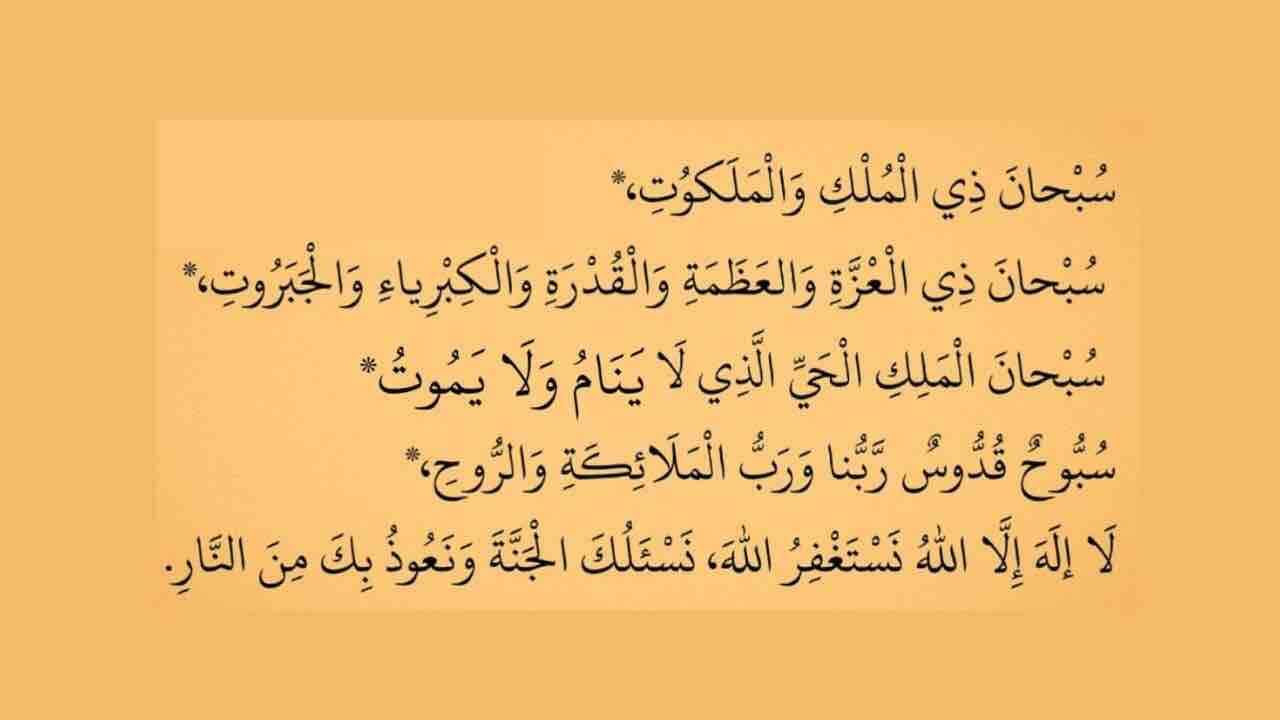Ўқилиши: «Субҳаана зил-мулки вал-малакуут. Субҳаана зил-ъиззати вал-ъазомати вал-қудроти вал-кибрийаа’и вал-жабаруут. Субҳаанал-маликил ҳаййиллазии лаа янааму ва лаа йамуут. Суббууҳун қуддусун Роббунаа ва Роббул-малааикати вар-Рууҳ. Лаа илааҳа иллаллооҳу настағфируллоҳ. Нас’алукал-жанната ва наъуузу бика минан-наар».