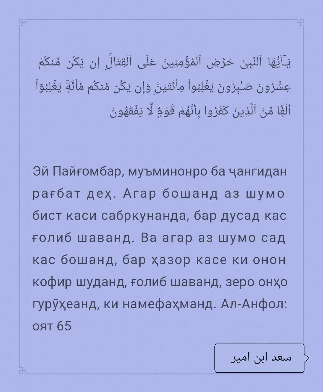 Қул ла-й юсӣбана илла ма катабаллоҳу лана Ҳува мавлана. Ва ъалаллоҳи фа-л ятаваккали-л-муъминун. 51.