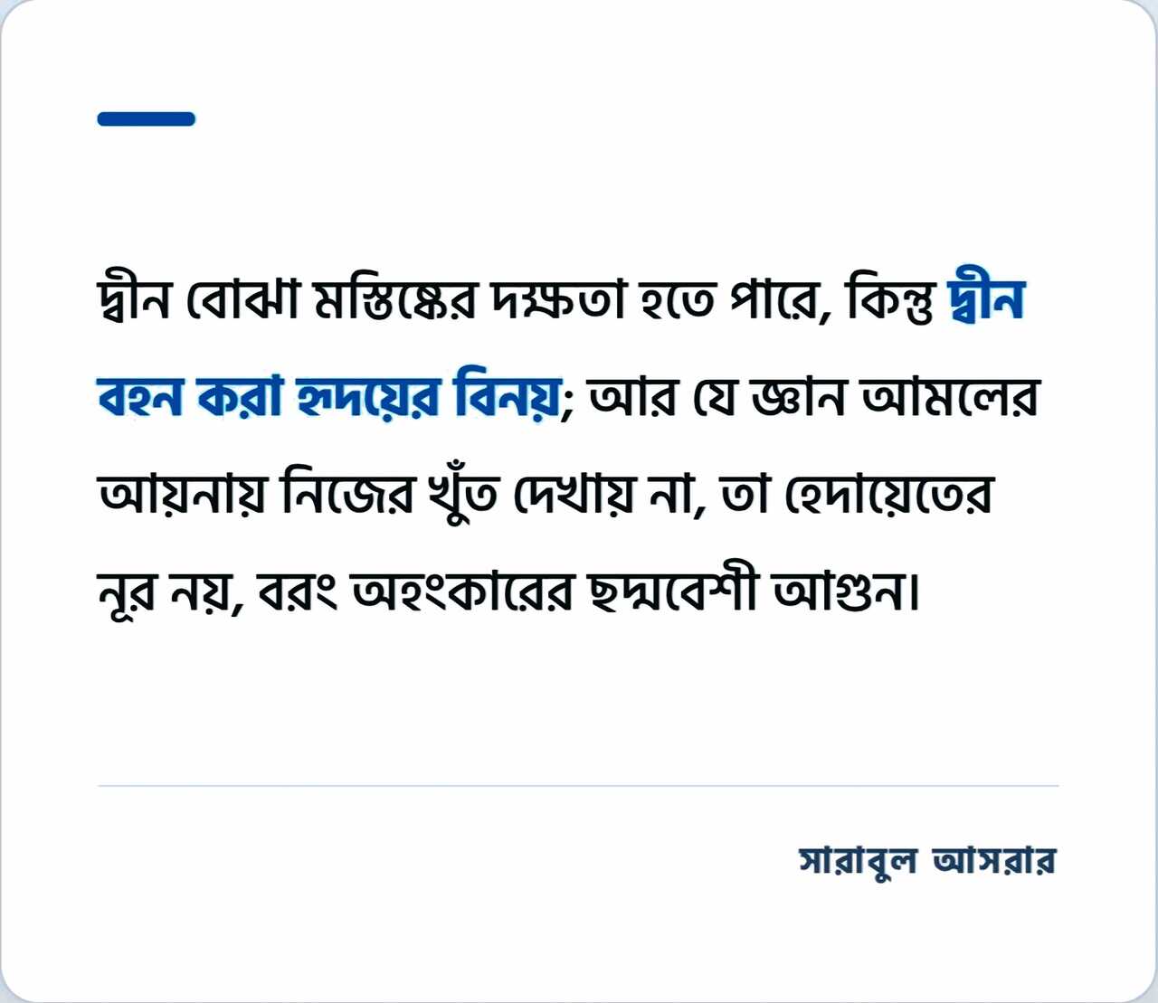 এভাবে জ্ঞানকে হয়তো কাগজের পাতায়, ক্যামেরার লেন্সে, চমৎকার গ্রাফিক্সের ডিজাইনে বা ছোট ছোট আকর্ষণীয় উদ্ধৃতিতে সীমাবদ্ধ করা যায়; কিন্তু তা দিয়ে কখনো হৃদয়কে আলোকিত করা যায় না। অথচ, দ্বীন যদি মস্তিষ্কের গণ্ডি পেরিয়ে হৃদয়ে না নামে, তবে তা কেবল কিছু ‘তথ্য’ হয়েই থেকে যায়, তা কখনো ‘নূর’ হতে পারে না।