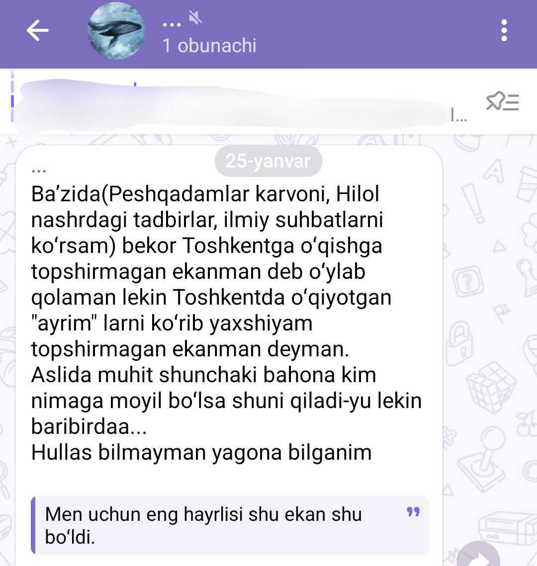 Rostdan hayrlisi shu ekan oʻzi boshidan dadam Toshkentga oʻqishga topshirishimga qarshi boʻlgan, endi tushunyapman yaxshiyam qarshi boʻlgan ekanlar.