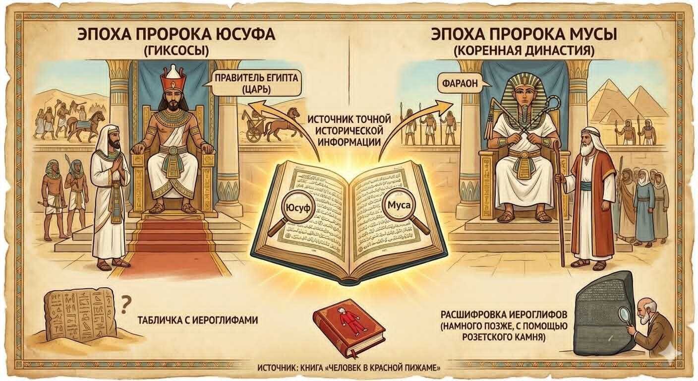 Интересен тот факт, что Иосиф (сын Израиля (Иакова), в Коране — Юсуф), также упоминаемый в Коране, никогда не обращается к правителю Египта, как к Фараону, а называет его Королем, тогда как Моисей определённо сталкивается с Фараоном. В Библии оба названы Фараонами. Это может показаться не такой уж большой проблемой, если только мы не постараемся определить место Иосифа в истории и не обнаружим, что правящей династией в Египте в то время были Гиксосы, которые были семитами по происхождению и не применяли термина “Фараон”, используемого коренными египтянами по отношению к своим правителям. Правителем Египта при Моисее был коренной египтянин, который выжил Гиксосов и начал притеснять племя Израилево. Если Мухаммад скопировал Библию, почему же он не скопировал эту историческую ошибку? И откуда он взял настолько точную информацию? В то время не существовало университетов с факультетами египтологии. Наука чтения иероглифов была утеряна сотнями лет ранее и восстановлена лишь спустя 1000 лет, после обнаружения Розетского камня. И благодаря этой детали вторая часть информации становится ещё более захватывающей и удивительной.