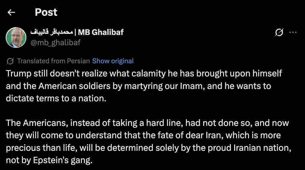🇮🇷🇺🇸Эрон парламенти спикери Mohammad Bagher Ghalibaf шундай деди: