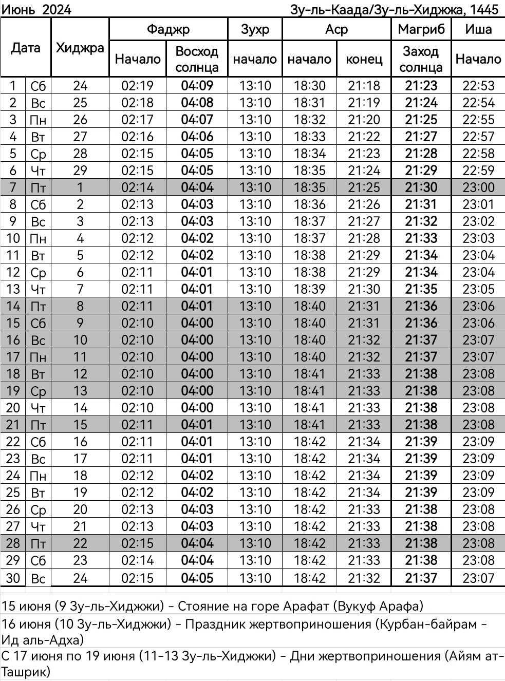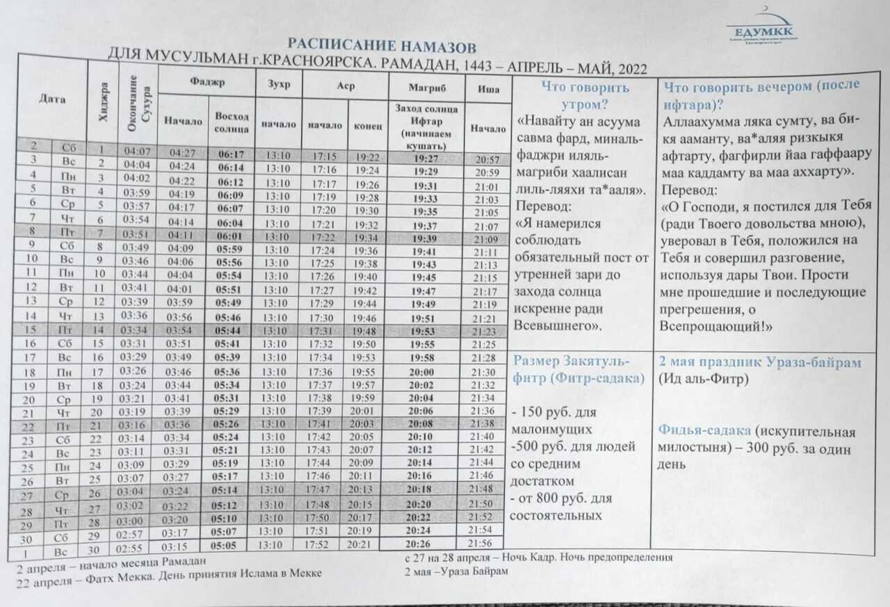 Расписание намаза, Красноярск. Июнь 2024.