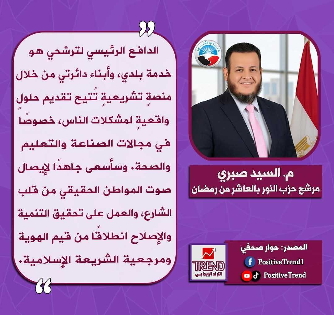 من حوار صحفي للمهندس السيد صبري/ مرشح حزب النور لمجلس النواب 2025 عن دائرة "العاشر من رمضان" بمحافظة الشرقية.