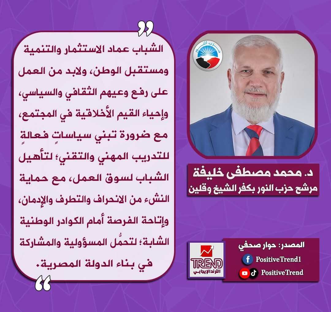 من حوار صحفي للدكتور محمد مصطفى خليفة/ مرشح حزب النور لمجلس النواب 2025 عن دائرة "كفر الشيخ وقلين" بمحافظة كفر الشيخ.