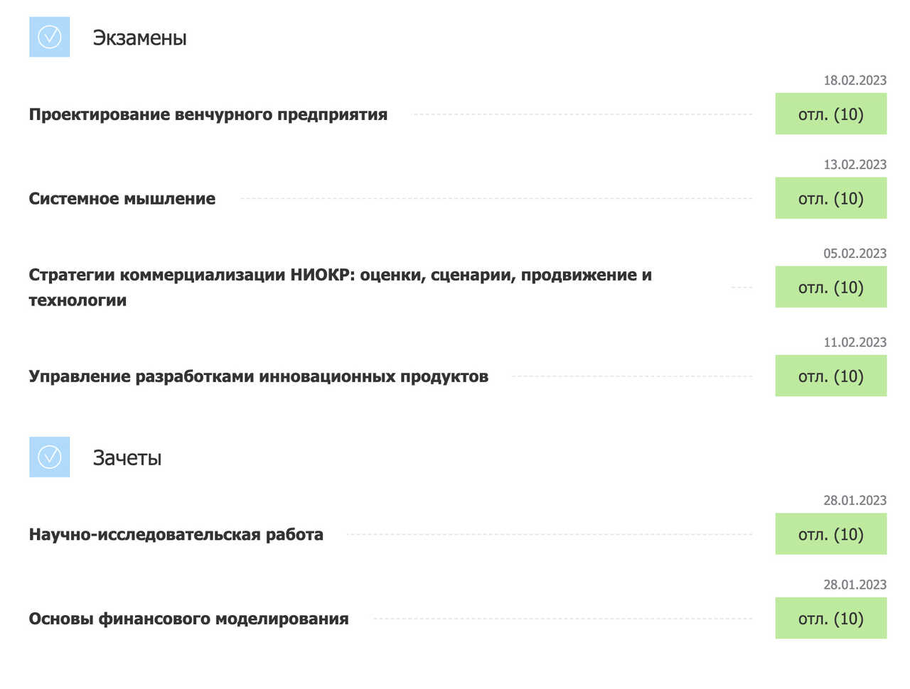 Некоторое время назад я поступил в магистратуру МФТИ на кафедру технологического предпринимательства. В приложенном скриншоте результаты первого семестра. Напоминаю в первую очередь себе, что наша обязанность как мусульман не быть лучше других, а каждый день становиться лучше себя самого.
