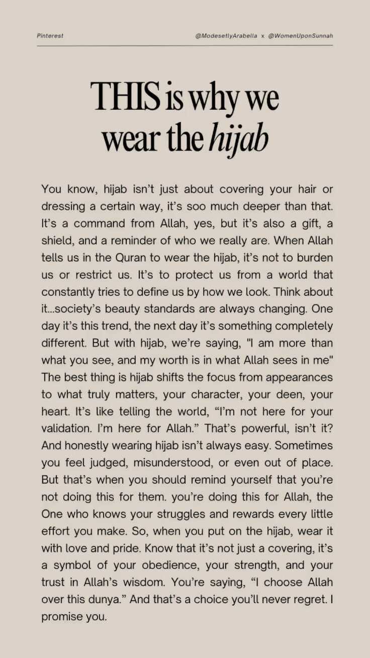 Bilasizmi, hijob shunchaki sochingizni yopish yoki ma\'lum bir tarzda kiyinish emas, balki undan ham chuqurroqdir. Bu Allohning amri, ha, lekin u shuningdek, sovg\'a, qalqon va bizning aslida kimligimizni eslatuvchidir. Alloh bizga Qur\'onda hijob kiyishni aytganda, bu bizga yuk tushirish yoki cheklash uchun emas. Bu bizni doimo tashqi ko\'rinishimiz bilan belgilashga harakat qiladigan dunyodan himoya qilish uchundir. Bir o\'ylab ko\'ring... jamiyatning go\'zallik me\'yorlari doimo o\'zgarib turadi. Bir kun bu tendentsiya, ertasi kuni butunlay boshqacha narsa. Lekin hijob bilan biz: "Men siz ko\'rgan narsadan ko\'ra ko\'proqman va mening qadr-qimmatim Alloh menda ko\'rgan narsada", deymiz. Eng yaxshi narsa shundaki, hijob diqqatni tashqi ko\'rinishdan chinakam muhim bo\'lgan narsaga, sizning fe\'l-atvoringizga, diningizga, qalbingizga qaratadi. Bu dunyoga: "Men sizning tasdiqlashingiz uchun emas. Men Alloh uchun bu yerdaman", deyish bilan barobar. Bu kuchli, shunday emasmi? Va rostini aytsam, hijob kiyish har doim ham oson emas. Ba\'zan o\'zingizni hukm qilingan, noto\'g\'ri tushunilgan yoki hatto o\'zingizni o\'rinsiz his qilasiz. Lekin aynan o\'shanda o\'zingizga buni ular uchun qilmayotganingizni eslatib turishingiz kerak. Siz buni Alloh uchun qilyapsiz, chunki u sizning kurashlaringizni biladi va har bir kichik harakatingizni mukofotlaydi. Shuning uchun, hijob kiyganingizda, uni sevgi va faxr bilan kiying. Bilingki, bu shunchaki niqob emas, balki sizning itoatkorligingiz, kuchingiz va Allohning donoligiga bo\'lgan ishonchingiz ramzi. Siz: "Men bu dunyodan Allohni tanlayman", deyapsiz. Va bu siz hech qachon afsuslanmaydigan tanlovdir. Sizga va\'da beraman.