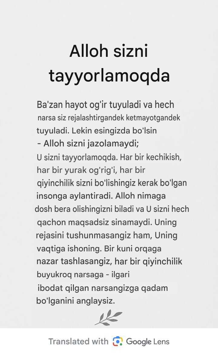 Bilasizmi, hijob shunchaki sochingizni yopish yoki ma'lum bir tarzda kiyinish emas, balki undan ham chuqurroqdir. Bu Allohning amri, ha, lekin u shuningdek, sovg'a, qalqon va bizning aslida kimligimizni eslatuvchidir. Alloh bizga Qur'onda hijob kiyishni aytganda, bu bizga yuk tushirish yoki cheklash uchun emas. Bu bizni doimo tashqi ko'rinishimiz bilan belgilashga harakat qiladigan dunyodan himoya qilish uchundir. Bir o'ylab ko'ring... jamiyatning go'zallik me'yorlari doimo o'zgarib turadi. Bir kun bu tendentsiya, ertasi kuni butunlay boshqacha narsa. Lekin hijob bilan biz: "Men siz ko'rgan narsadan ko'ra ko'proqman va mening qadr-qimmatim Alloh menda ko'rgan narsada", deymiz. Eng yaxshi narsa shundaki, hijob diqqatni tashqi ko'rinishdan chinakam muhim bo'lgan narsaga, sizning fe'l-atvoringizga, diningizga, qalbingizga qaratadi. Bu dunyoga: "Men sizning tasdiqlashingiz uchun emas. Men Alloh uchun bu yerdaman", deyish bilan barobar. Bu kuchli, shunday emasmi? Va rostini aytsam, hijob kiyish har doim ham oson emas. Ba'zan o'zingizni hukm qilingan, noto'g'ri tushunilgan yoki hatto o'zingizni o'rinsiz his qilasiz. Lekin aynan o'shanda o'zingizga buni ular uchun qilmayotganingizni eslatib turishingiz kerak. Siz buni Alloh uchun qilyapsiz, chunki u sizning kurashlaringizni biladi va har bir kichik harakatingizni mukofotlaydi. Shuning uchun, hijob kiyganingizda, uni sevgi va faxr bilan kiying. Bilingki, bu shunchaki niqob emas, balki sizning itoatkorligingiz, kuchingiz va Allohning donoligiga bo'lgan ishonchingiz ramzi. Siz: "Men bu dunyodan Allohni tanlayman", deyapsiz. Va bu siz hech qachon afsuslanmaydigan tanlovdir. Sizga va'da beraman.