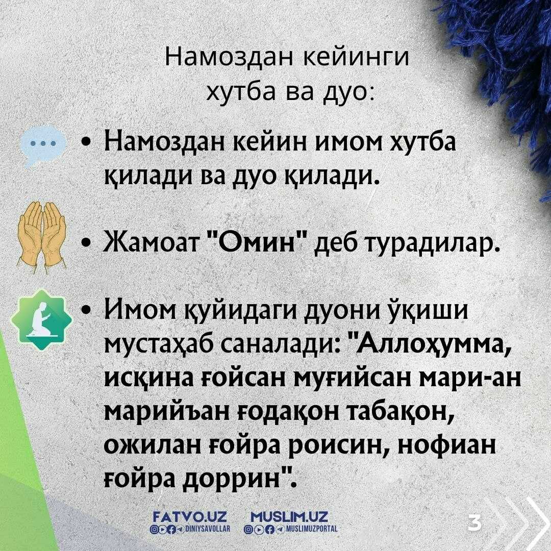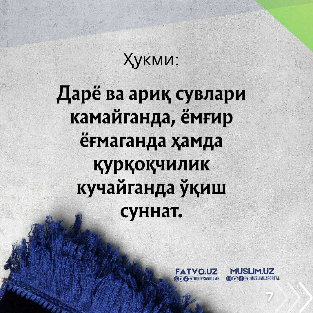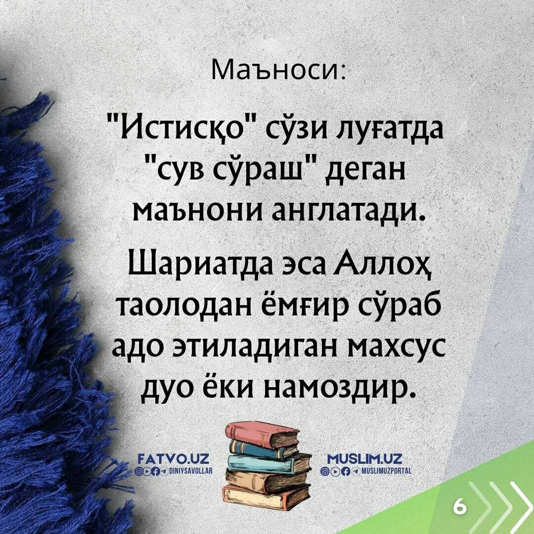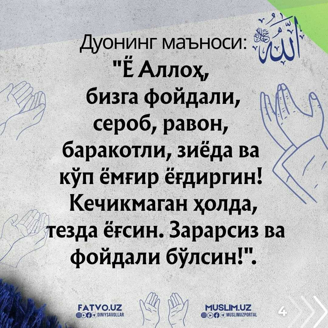 “Ё Аллоҳ, бизга фойдали, сероб, равон, баракотли, зиёда ва кўп ёмғир ёғдиргин! Кечикмаган ҳолда, тезда ёғсин. Зарарсиз ва фойдали бўлсин!”
