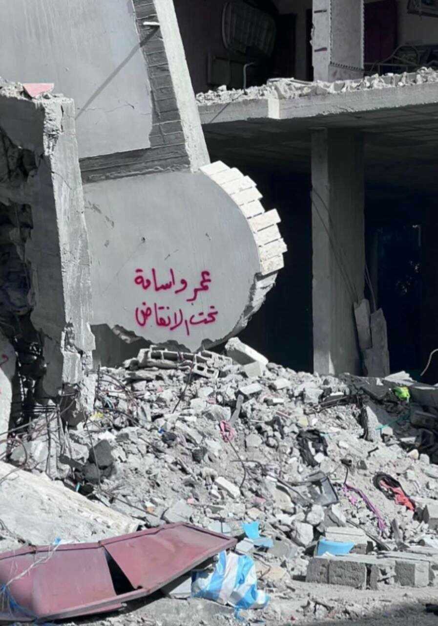 "ዑመርና ኦሳማ ከፍርስራሹ ስር ናቸው" ይላል ግርግዳው ላይ የተፃፈው።