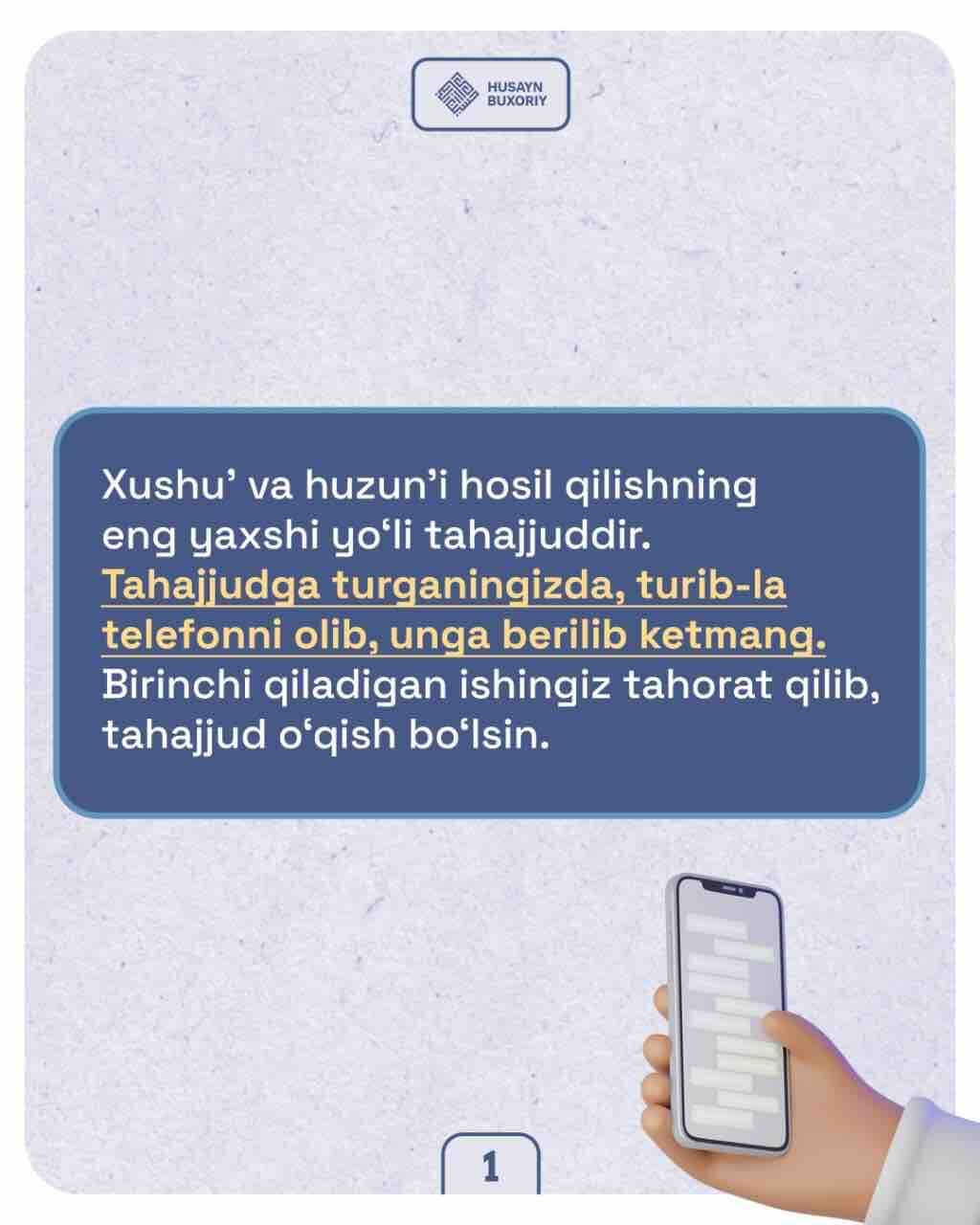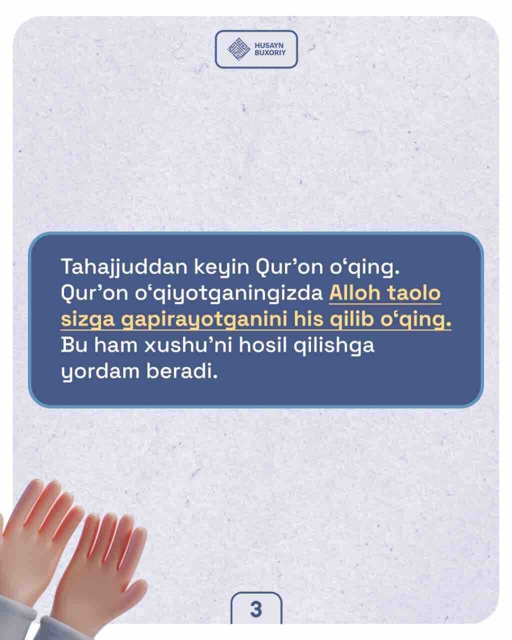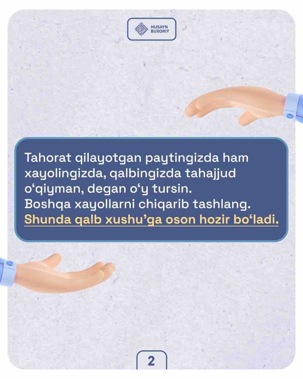 ✅ Ustozimiz Husayn Buxoriydan xushuʼ va huzuʼni hosil qilishda qiynalayotganlar uchun ikki tavsiya.