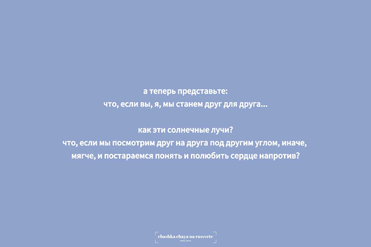 так вот, что, если попытаться, как солнце, подарить свое понимание, доброту, ласку окружающим? что, если мы перестанем глядеть друг на друга и видеть врагов? что, если чуточку любви и заботы вложить в свои намерения по отношению к окружающим?