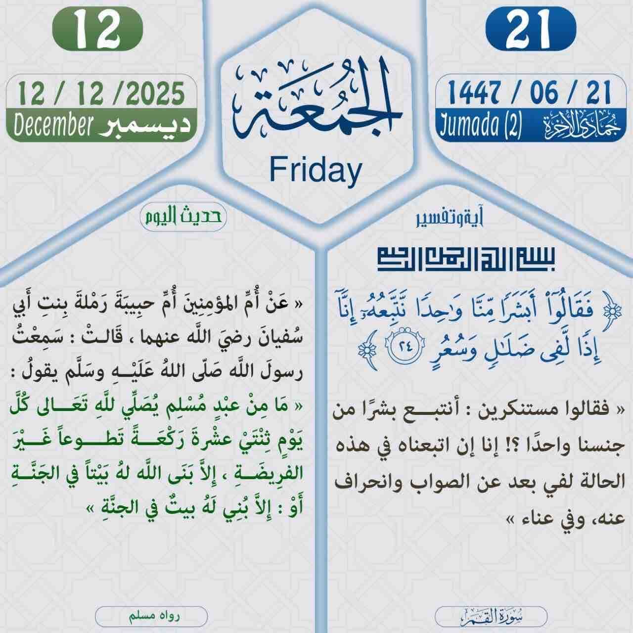 الجمعة ١٤٤٧/٦/٢١ الموافق ٢٠٢٥/١٢/١٢ تذكير متبقي على رمضان ٧٠ يوم من كان عليه قضاء من رمضان أو كفارة فليبادر بالصوم قبل أن تمنعه الأعذار من الصيام ويدركه شهر رمضان لهذا العام