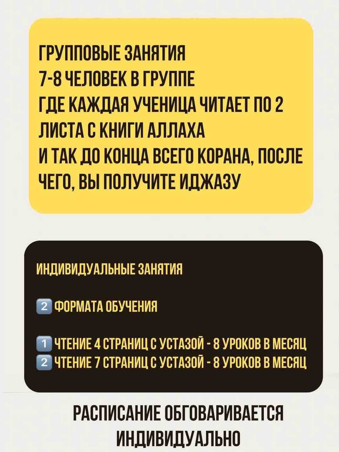 Индивидуальные: по 4 или 7 страниц за урок, и так до окончания всего Корана