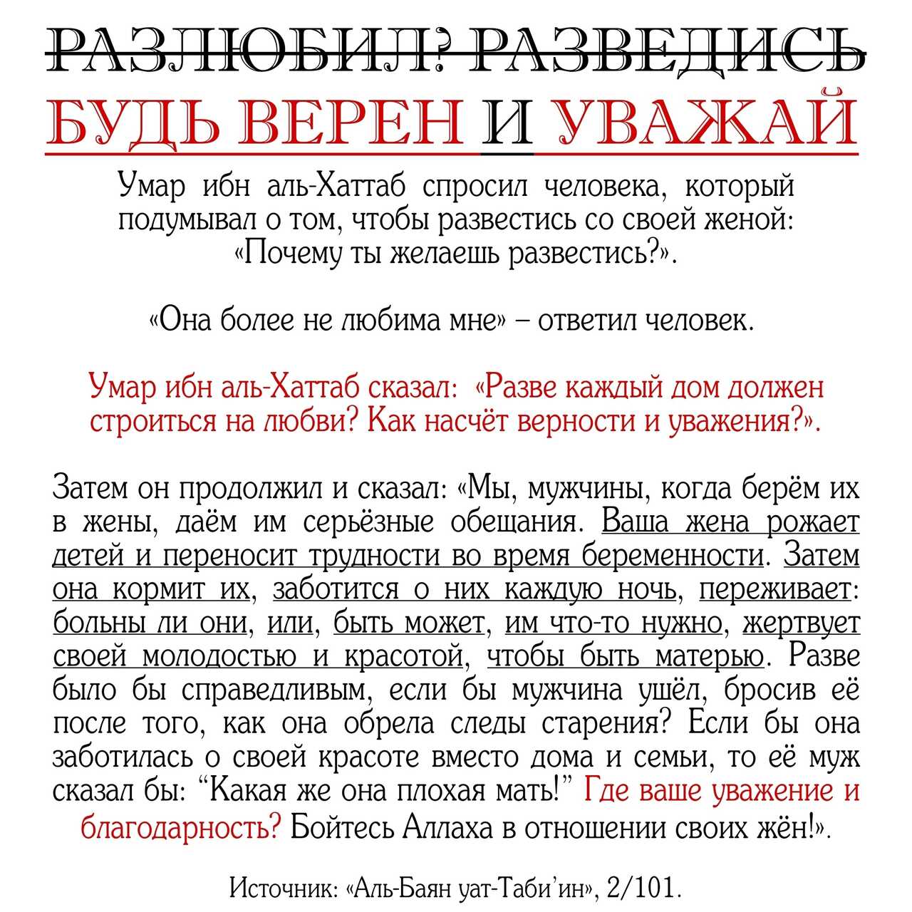 Ваша жена рожает и переносит трудности во время беременности, заботится о ваших детях... а разве справедливо их бросать после того как они обрели следы старости... Умар ибн Хаттаб