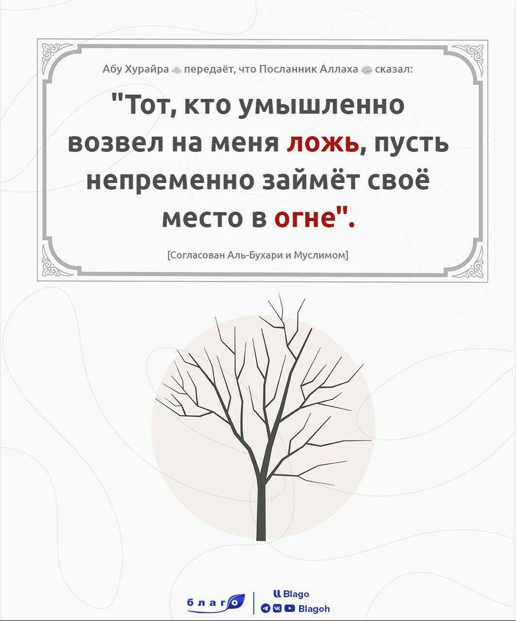 🔸Абу Хурайра (да будет доволен им Аллах) передаёт, что Посланник Аллаха (мир ему и благословение Аллаха) сказал: "Тот, кто умышленно возвел на меня ложь, пусть непременно займёт своё место в огне".