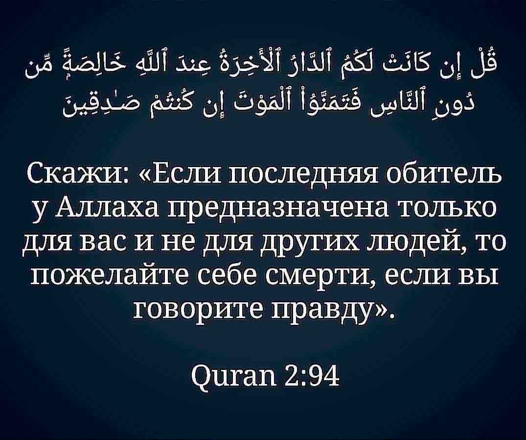 Посланник Аллаха, да благословит его Аллах и приветствует, предложил иудеям пожелать себе смерти и поставил их в неловкое положение. Они упорно настаивали на своей правоте, и теперь им предстояло сделать простой выбор. Они должны были либо уверовать в Аллаха и Его посланника, да благословит его Аллах и приветствует, либо доказать свою убежденность в собственной правоте, пожелав себе смерти, сразу после которой они предполагали оказаться в райской обители, предназначенной только для них. Однако они отказались поступить так и дали понять каждому, что являются упрямыми неверующими и сознательно противятся Аллаху и Его посланнику, да благословит его Аллах и приветствует. Всевышний сообщил, что они никогда не пожелают себе смерти, потому что исповедуют неверие, совершают грехи и прекрасно осознают, что смерть обернется для них скорой расплатой за совершенные дурные поступки.