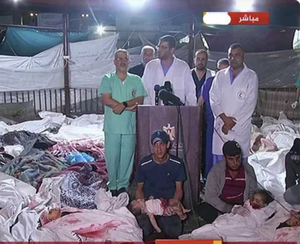 دي صورة من المؤتمر الصحفي لوزارة الصحة الفلسطينية من قلب المستشفى الأهلي المعمداني،