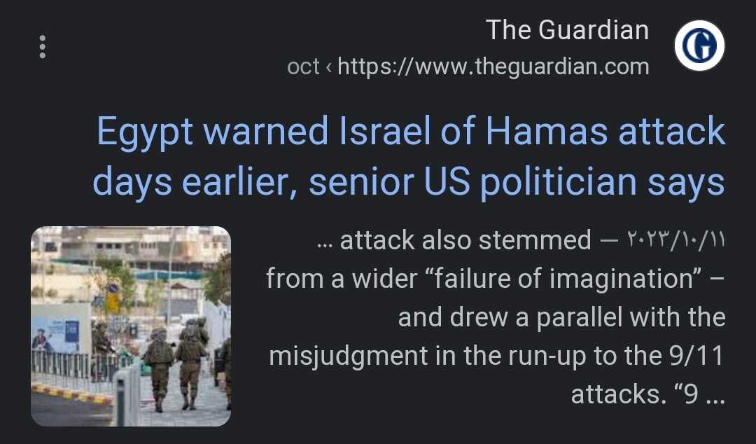 كنت سمعت في أول الأزمة اخواتنا في فلسطين أن مصر حزرت إسرائيل من احتمال هجوم عليها من قطاع غزة و من مواقع كبيرة عمرها ما هتقول اي حاجه و الاهم أن مصر منفتش الخبر ده و اصلا مستبعدش أنهم كانوا عرفين اصلا قبل مصر فلما فكرت فيها ازاي اسرائيل تعرف ان في هجوم محتمل عليها و متتحركش بدعم لقواتها قرب القطاع و متعملش اي حاجه اول 3 ايام من الهجوم فطلع أنهم اصلا لما عرفوا المعلومه دي سابوا المجاهدين يعملوا كده عشان ينفذوا مخطط قديم عندهم بتهجير اخواتنا في فلسطين لسيناء عشان ينهوا حاجة اسمها القضية الفلسطينية و لما يتهجروا علي هناك اكيد هيكون فيه اكيد عملاء بنهم و هنا انا مش بزم في اخواتنا بس زي ما في الحلو في الوحش و هينفذوا عمليات من سيناء علي الكيان الصهيوني ف الكيان هيضطر للرد و يدخل مصر حرب مع اسرائيل و هنا فهمت ليه في حملات طائرات في البحر المتوسط