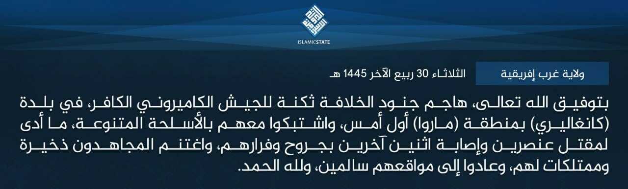 بتوفيق الله تعالى، هاجم جنود الخلافة ثكنة للجيش الكاميروني الكافر، في بلدة (كانغاليري) بمنطقة (ماروا) أول أمس، واشتبكوا معهم بالأسلحة المتنوعة، ما أدى لمقتل عنصرين وإصابة اثنين آخرين بجروح وفرارهم، واغتنم المجاهدون ذخيرة وممتلكات لهم، وعادوا إلى مواقعهم سالمين، ولله الحمد.