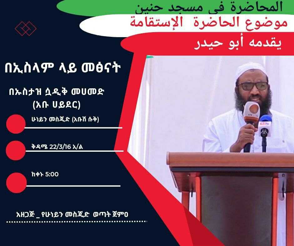 ቅዳሜ 5 ሰዐት ኡስታዝ ሷዲቅ ሙሀመድ ( አቡ ሀይደር ) በኮተቤ ይከትማል!!!