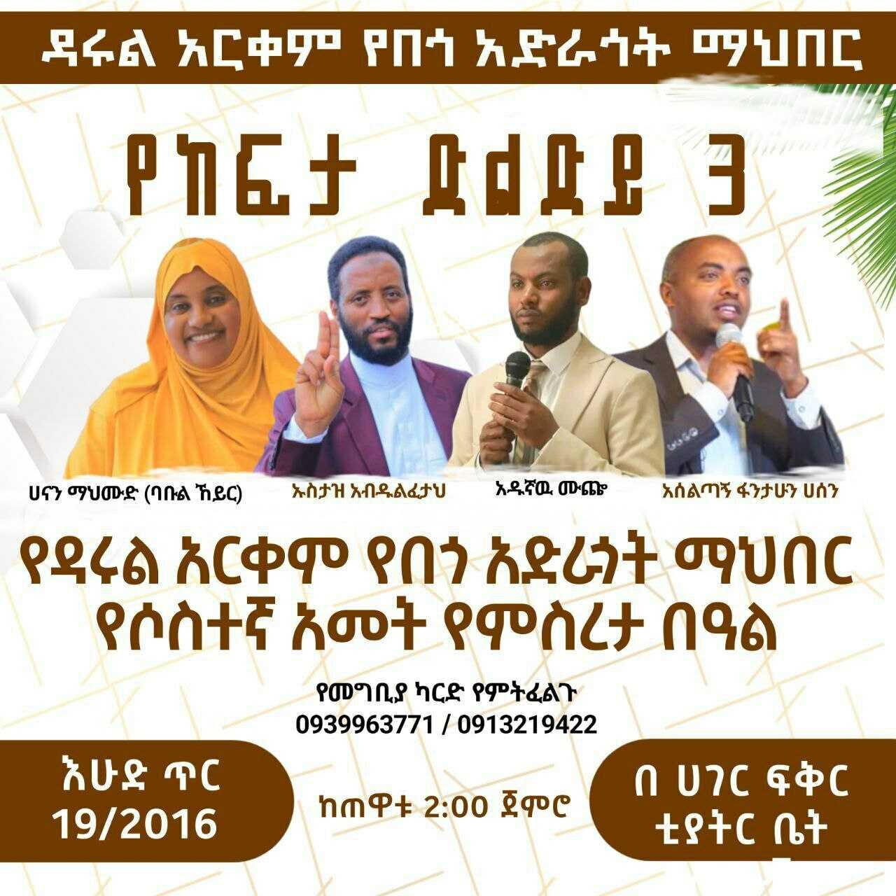 🎉በበጎነት ወደ ጀነት መሄጃ መንገዱን በፅኑ አቋም አጥብቆ ከያዘ እነሆ ሶስት አመታት ተቆጠሩ። በአይታሞች ፈገግታ በአዛውንት ምርቃት በመሻኢኾች ዱዓ በእናንተ ቤተሰቦቻችን አለን ባይነት መስመር ውስጥ አልፎና ደምቆ ከዳዴ አንስቶ እነሆ በአላህ ፍቃድ በሶስት አመታት ውስጥ በሁለት እግሩ ቆሟል። ታድያ ይሄን ጉዞውን በጣም በተሻለ እና ከዚህም ከፍ ባለ ፣መጥቼበት በማላውቀው አዲስ ስራ፣ ያለፉት መንገዶቼን በወፍ በረር ሶስቱን አመት አብራችሁኝ ላሳስለፋችሁ በመድረክ አሳያችኋለው ሲል መድረኩን አሰናድቷል። የመልካምነት መንገድ እንኳን የተሳካው ውጣ ውረዱም ያጓጓልና ጥር በእሁድ ቀን ወርሀ ጥር 19/2016  በሀገር ፍቅር ቲያትር ከጠዋቱ 2:00 ሲል  የሚጀመር ስለሆነ፤ በመድረኩ ላይ በመገኘት የድግሳችን ድምቀት ሁኑ እንላለን ።