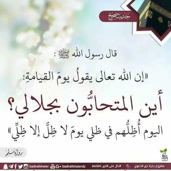 ✍عَنْ أَبِي هُرَيْرَةَ رَضِيَ اللهُ عَنْهُ قَالَ: قَالَ رَسُولُ اللَّهِ صَلَّى اللَّهُ عَلَيْهِ وَسَلَّمَ : "إِنَّ اللَّهَ تَبَارَكَ وَتَعَالَى يَقُولُ يَوْمَ الْقِيَامَةِ: أَيْنَ الْمُتَحَابُونَ بِجَلَالِي؟ الْيَوْمَ أَظْلُّهُمْ فِي ظِلِّي يَوْمَ لَا ظل إلا ظلى"