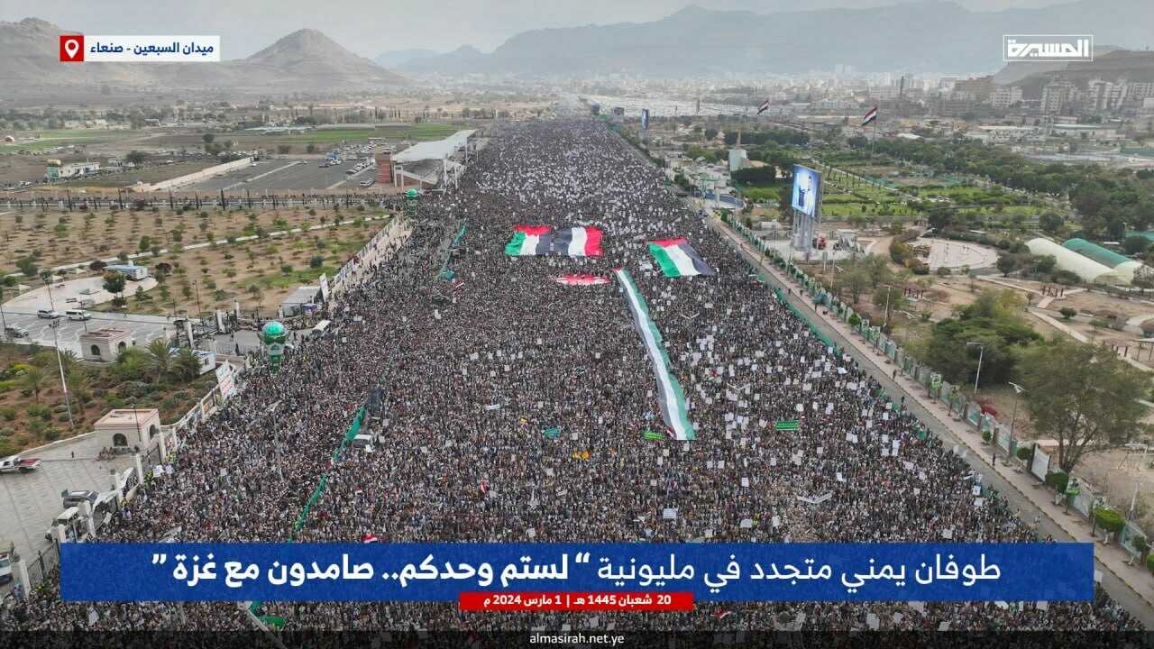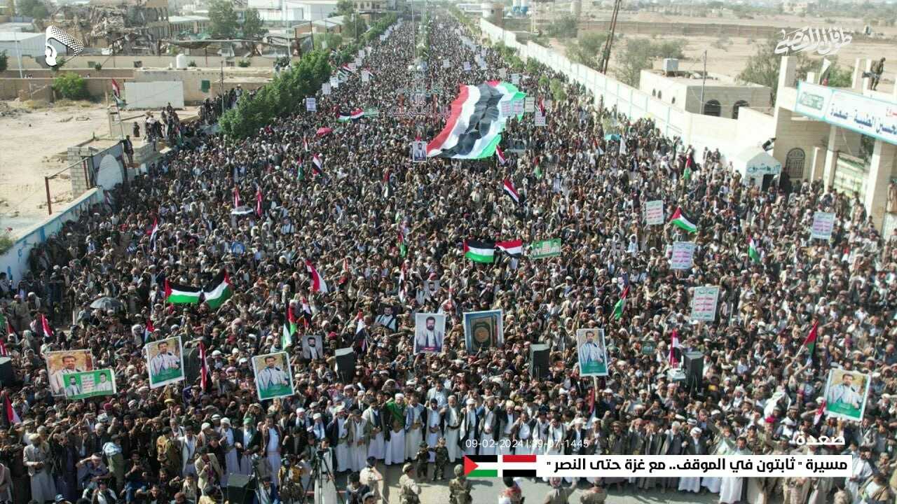 ለ21ኛ ተከታታይ ሳምንት የየመን ህዝብ በየክፍለ ሀገሩ ለፍልስጤም ድጋፍ በሚሊዮን የሚቆጠሩ ሰዎች ራደመቁት ሰልፍ በማካሄድ በዚህ ሳምንትም “እናንተ ብቻችሁን አይደላችሁም...ከጋዛ ጋር የምንፀና ነኝ” በሚል መሪ ቃል ተካሂዷል።