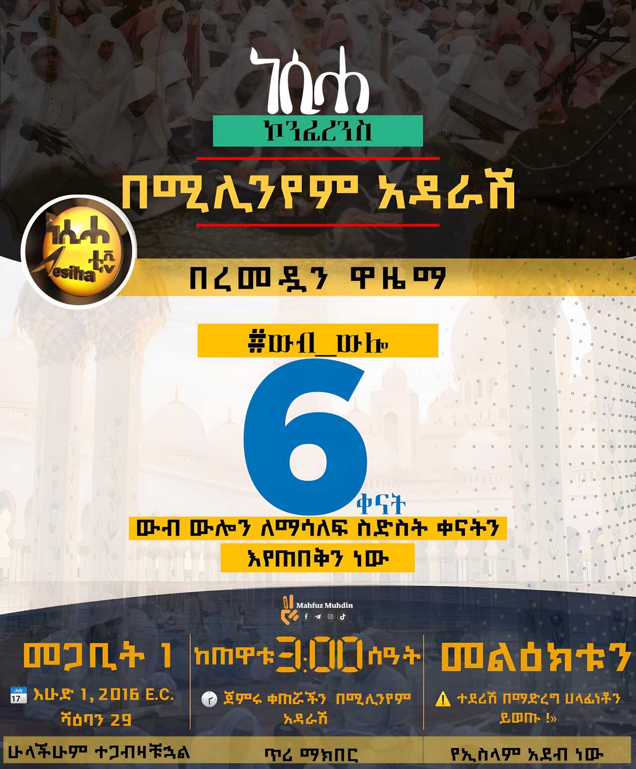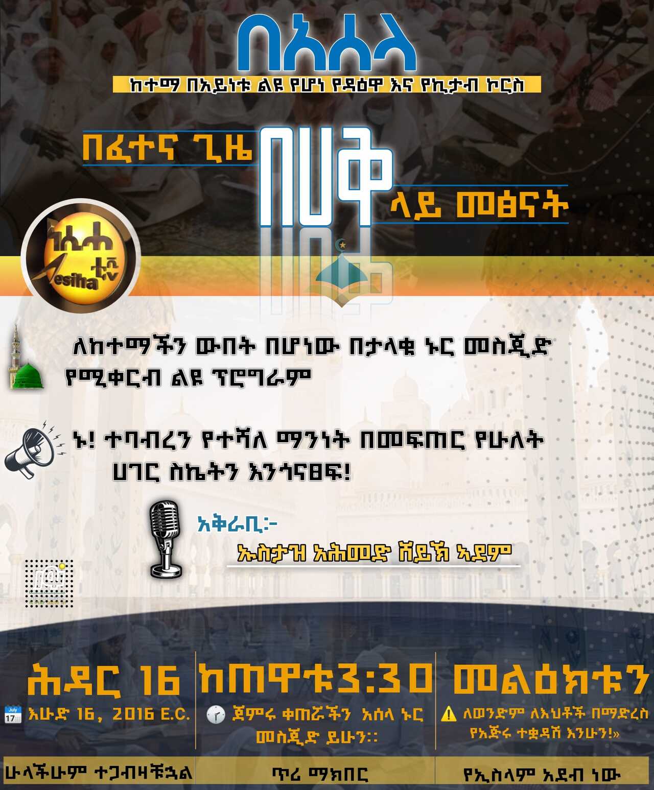 ለከተማችን ውበት በሆነው በትልቁ መስጂደ-ኑር የሚቀጥል ይሆናል ከሱብሂ ሰላት እስከ 2:00 ሰዓት