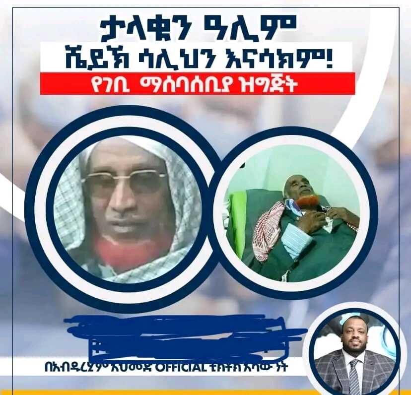 እድሜያቸውን ሙሉ ትውልድ ሲቀርፁ ለነበሩት ታላቁ አሊም ሸይክ ሳሊህን ለማሳከም የሚሆን ሁሉም ወገኖቻችን ትሳተፉ ዘንድ የዛሬ ሻይ ቡና የምትሉበትን ወጫችሁን የአባታችነን ስቃይ በጋራ ቆመን እንታደገው ዘንድ ከእናንተ ከ100 ብር ጀምሮ ድጋፋችሁን በአላህ ስም እንጠይቃለን።