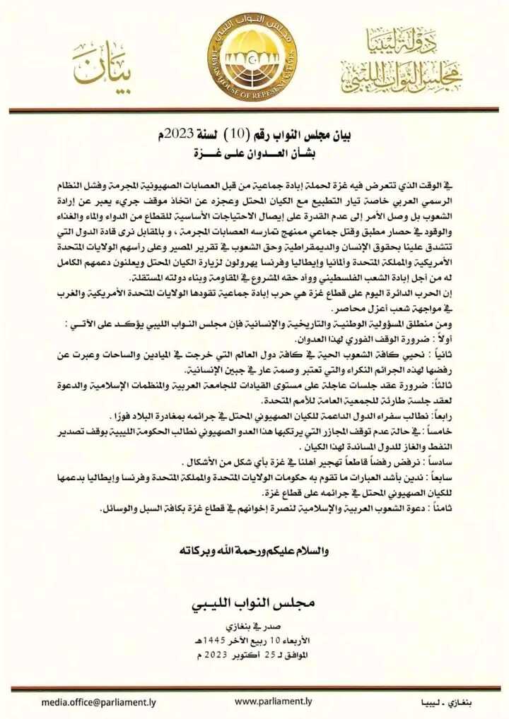 "እስራኤልን የሚደግፉ አገሮች አምባሳደሮቻቸው በአስቸኳይ ሊቢያን ለቀው እንዲወጡ እንጠይቃለን። መንግስታችን የእስራኤልን ወረራ ለሚደግፉ አገሮች ዘይትና ጋዝ መላክ እንዲያቆምና በማንኛውም መንገድ ፍልስጤምን ለመደገፍ ዝግጁ መሆናችንን እንገልፃለን"