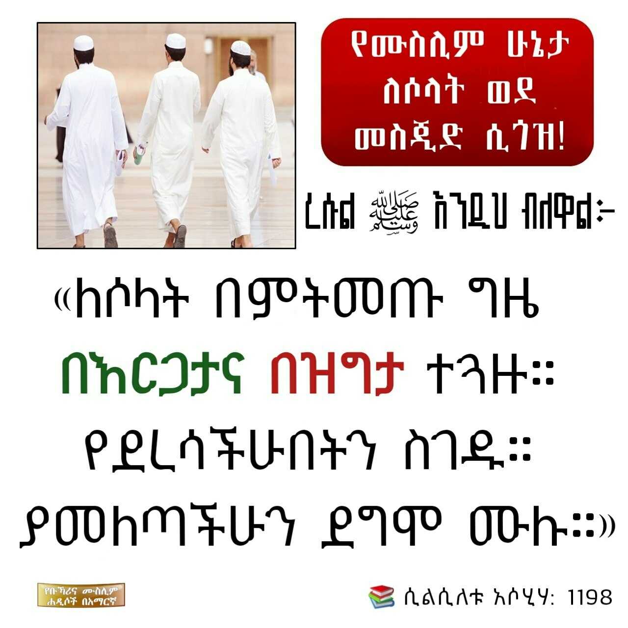 “ለሶላት በምትመጡ ግዜ በእርጋታና በዝግታ ተጓዙ። የደረሳችሁበትን ስገዱ። ያመለጣችሁን ደግሞ ሙሉ።”