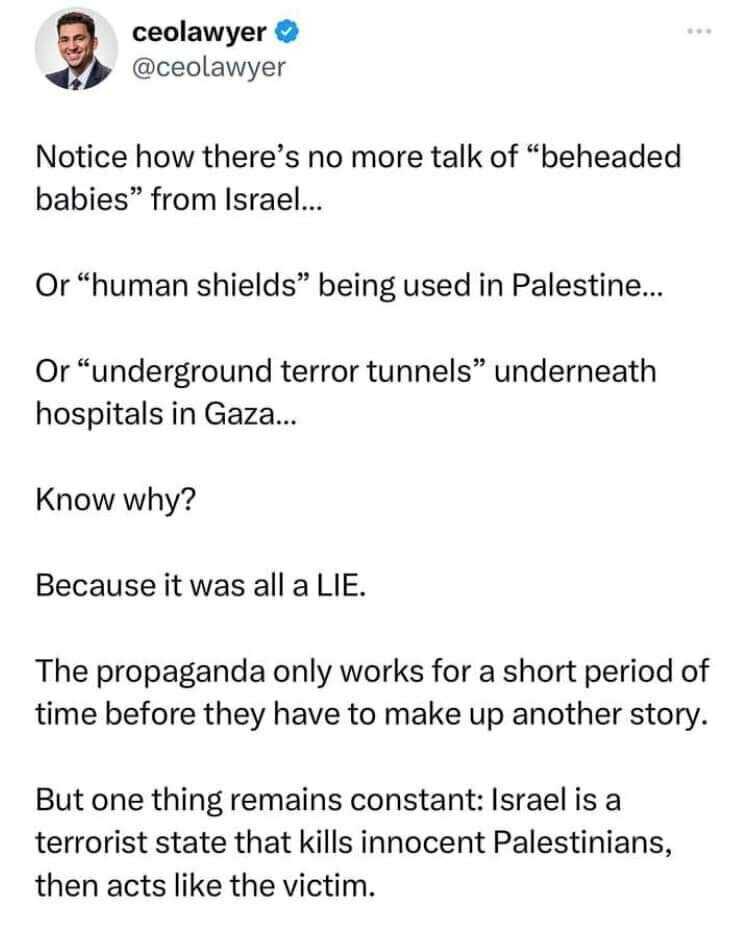 አይሁዶች እጅግ አስቀያሚ ጨካኞች መሆናቸውን ከዚህ መግለጫ በላይ የሚያረጋግጥ የለም ! አይሁዶች በአሁኑ ሰአት በሙስሊሞች ላይ ቅዱስ ጦርነት እያደረጉ እንደሆነ ነው እየቀሰቀሱ የሚገኙት ። ሙስሊሞች ግን ጦርነት የኛ ጉዳይ አይደለም ብለው ፍልስጤሞችን ክደዋቸዋል ።