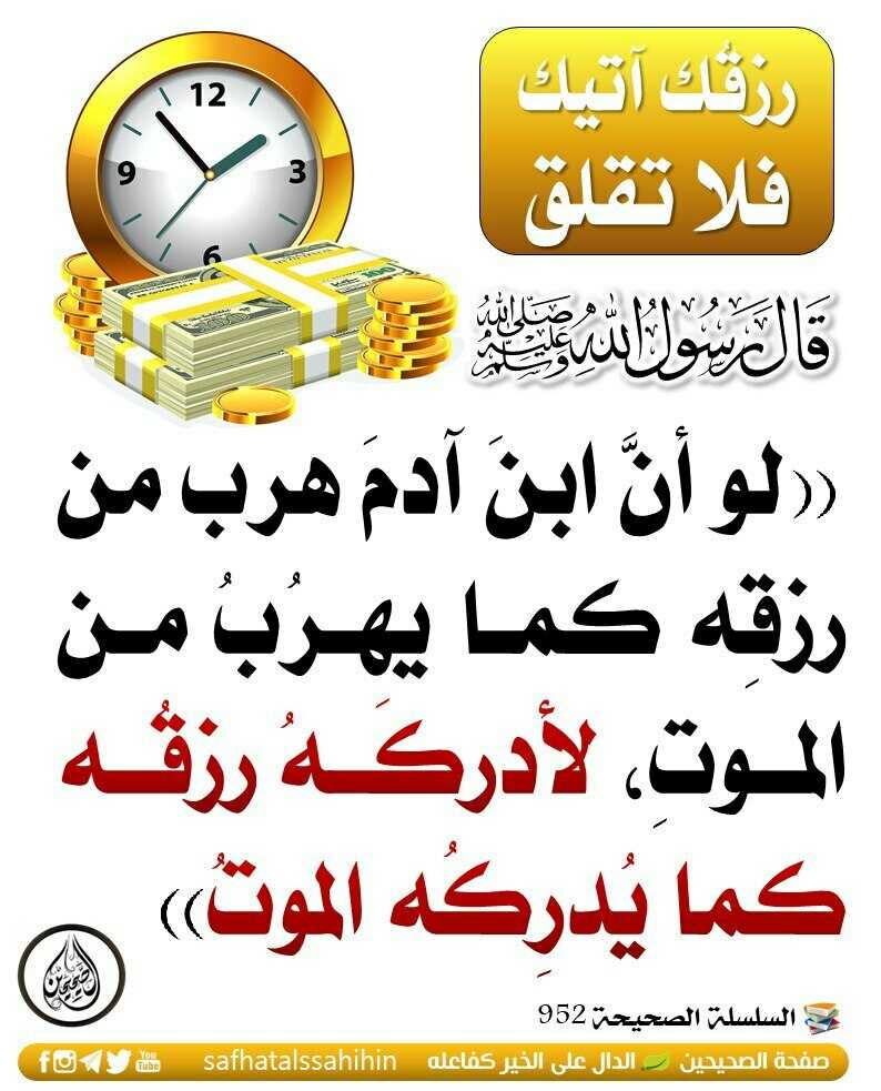قال ﷺ: "لو أنّ ابن آدم هرب من رزقه كما يهرب من الموت، لأدركه رزقُه كما يدركُه الموت"