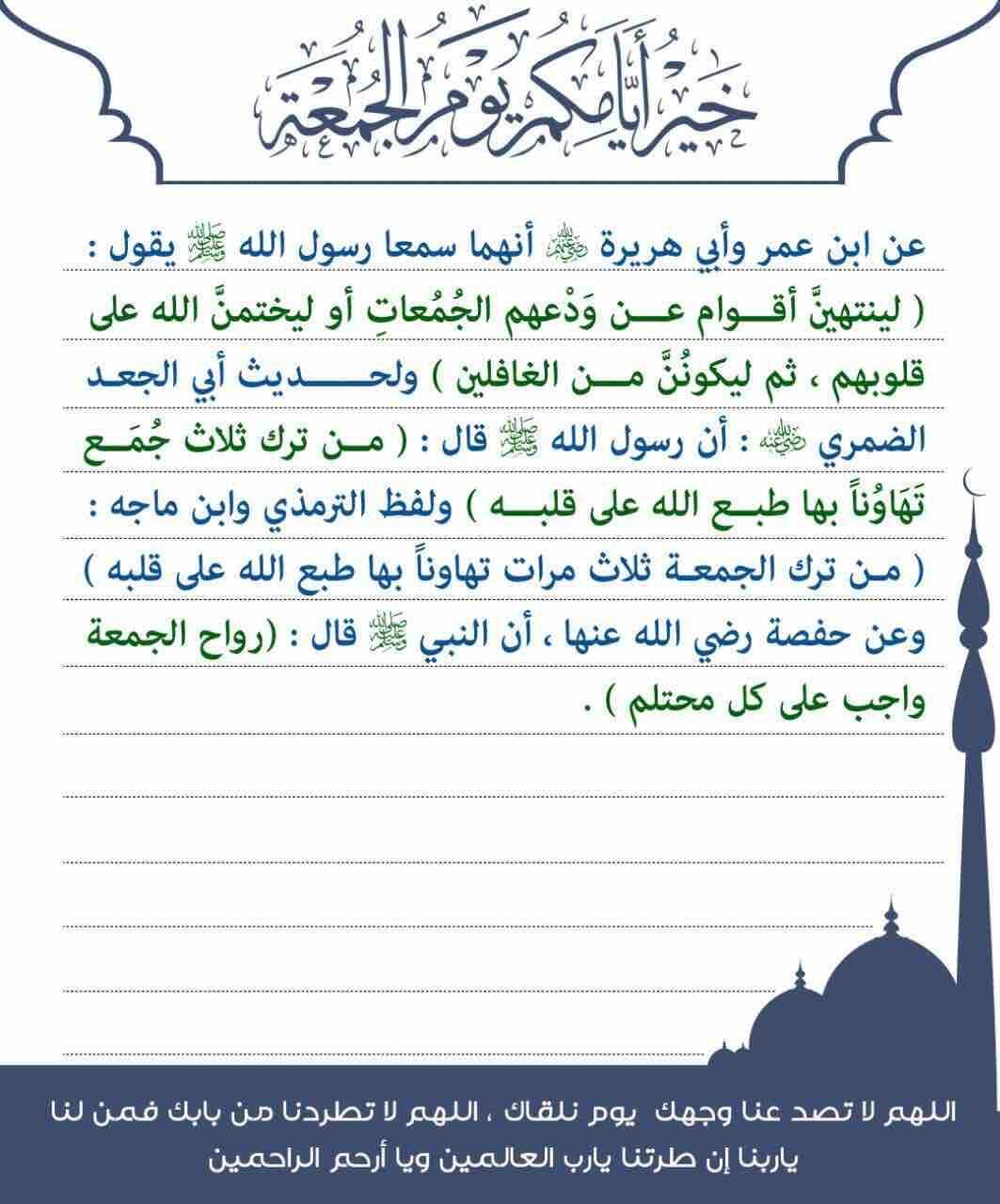 قال الرسول ﷺ (إن من أفضل أيامكم يوم الجمعة : فيه خلق آدم، وفيه قبض، وفيه النفخة، وفيه الصعقة……)