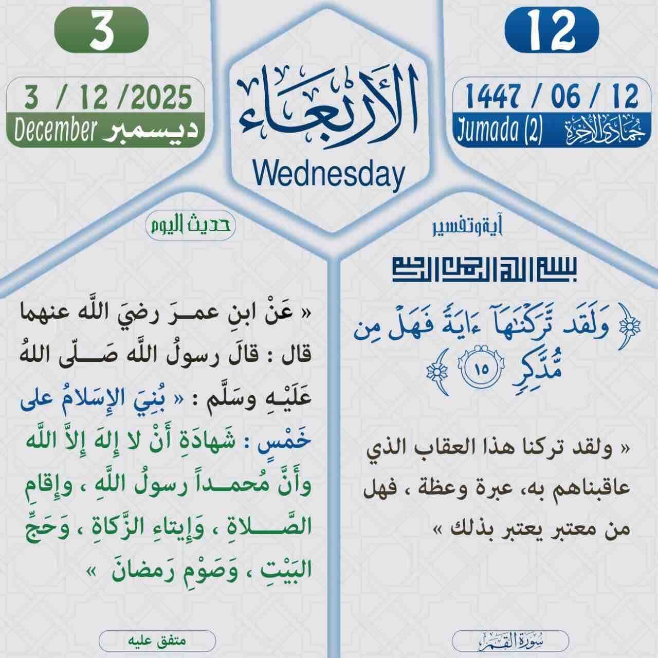 الأربعاء ١٤٤٧/٦/١٢ الموافق ٢٠٢٥/١٢/٣ تذكير متبقي على رمضان ٧٩ يوم من كان عليه قضاء من رمضان أو كفارة فليبادر بالصوم قبل أن تمنعه الأعذار من الصيام ويدركه شهر رمضان لهذا العام