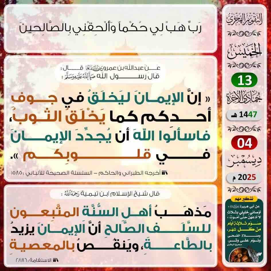 الخميس ١٤٤٧/٦/١٣ الموافق ٢٠٢٥/١٢/٤ تذكير متبقي على رمضان ٧٨ يوم من كان عليه قضاء من رمضان أو كفارة فليبادر بالصوم قبل أن تمنعه الأعذار من الصيام ويدركه شهر رمضان لهذا العام