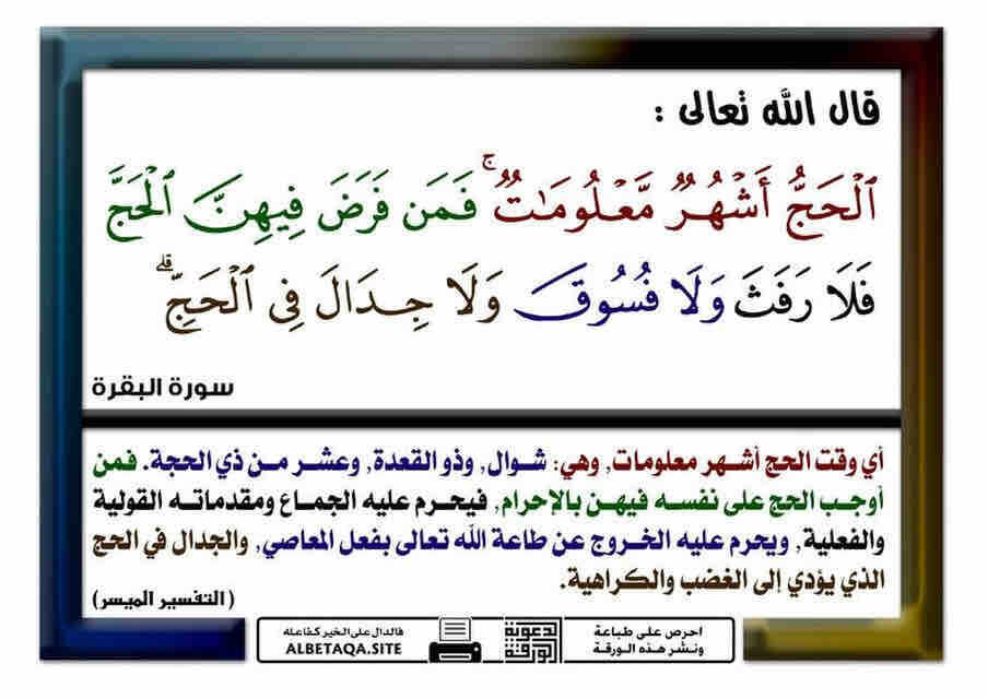 قال الله تعالى(الحج أشهر معلومات فمن فرض فيهن الحج فلا رفث ولا فسوق ولا جدال في الحج وما تفعلوا من خير يعلمه الله وتزودوا فإن خير الزاد التقوى واتقون يا أولي الألباب) البقرة197