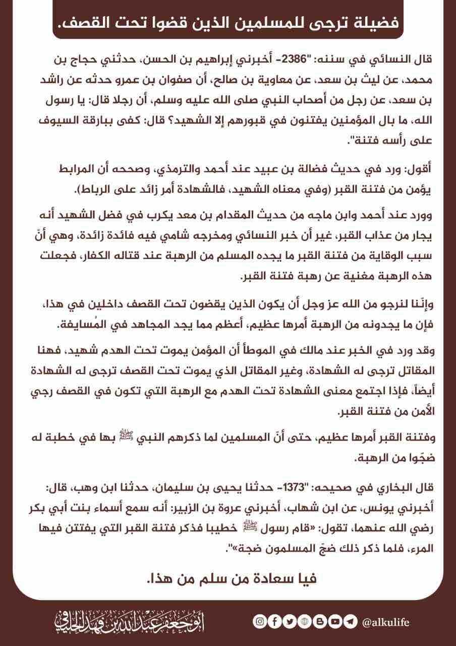وأيضاً المروي في قولها: «بل أصدِّق الله ورسوله»، وكذا حال أهل الإيمان، إيمانهم يجعلهم وكأنهم يعاينون الفضيلة معاينةً، نسأل الله عز وجل أن يربط على قلوب المصابين بأهليهم.