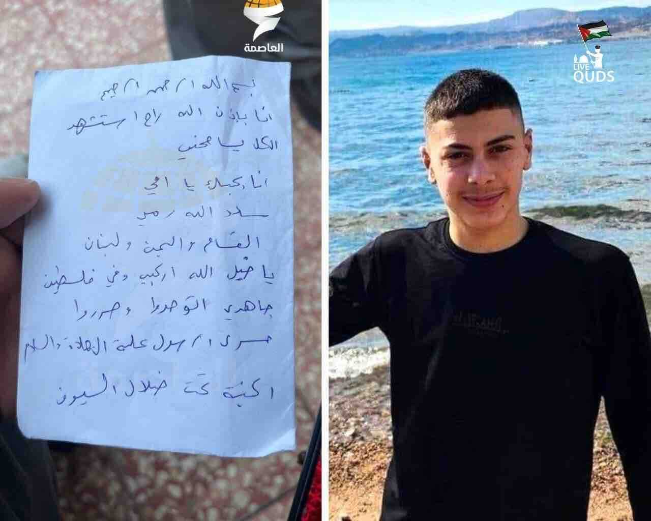 Бир неча кун олдин босқинчилар Қудснинг Эски шаҳрида отиб ташлаган шаҳид, 15 ёшли Муҳаммад Абу Снейнанинг васиятномаси.