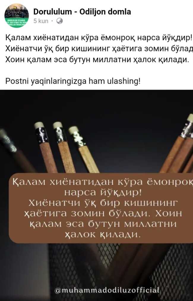 Ундан бир марта сабабини сўраганимда: «Шундай қилсам сиз тик юрасиз ва нимадир учун бош эгишингизга тўғри келмайди» деган эди.