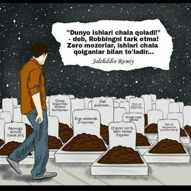 ,,Kimni yaxshi ko'rsang ham,undan ajralasan.Qancha yashasang ham,albatta bir kun o'lasan.Qancha amal qilsang ham,albatta ajrini olasan".