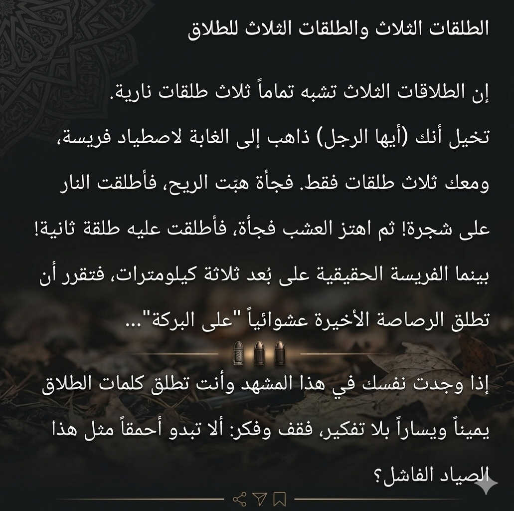 «Поистине, Аллах установил развод из-за нужды Своих рабов в расставании, когда совместная жизнь становится невозможной. Он не сделал его игрушкой в руках забавляющихся, которые разводятся, как им вздумается. А тот, кто превращает Писание Аллаха в шутку, заслуживает наказания».