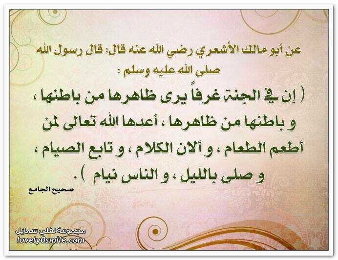 “Rosululloh sollallohu alayhi vasallam aytdilar: «Darhaqiqat, jannatda ichidan tashqarisi, tashqarisidan ichi koʻrinib turadigan xonalar bordirki, Alloh taolo ularni taom yedirgan, soʻzini muloyim qilgan, roʻza tutgan va odamlar uxlagan paytda kechalari namoz oʻqigan kishilar uchun tayyorlab qoʻygandir”.