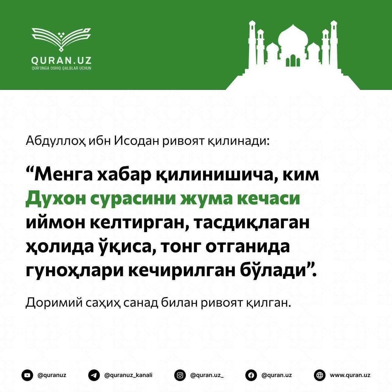 Хуросонлик: «Ундай қилмайман, лекин унинг ишини Аллоҳга ҳавола қиламан ва учрашган кунимизда Роббига шикоят қиламан. Ҳасбуналлоҳу ва ниъмал вакил», деди.