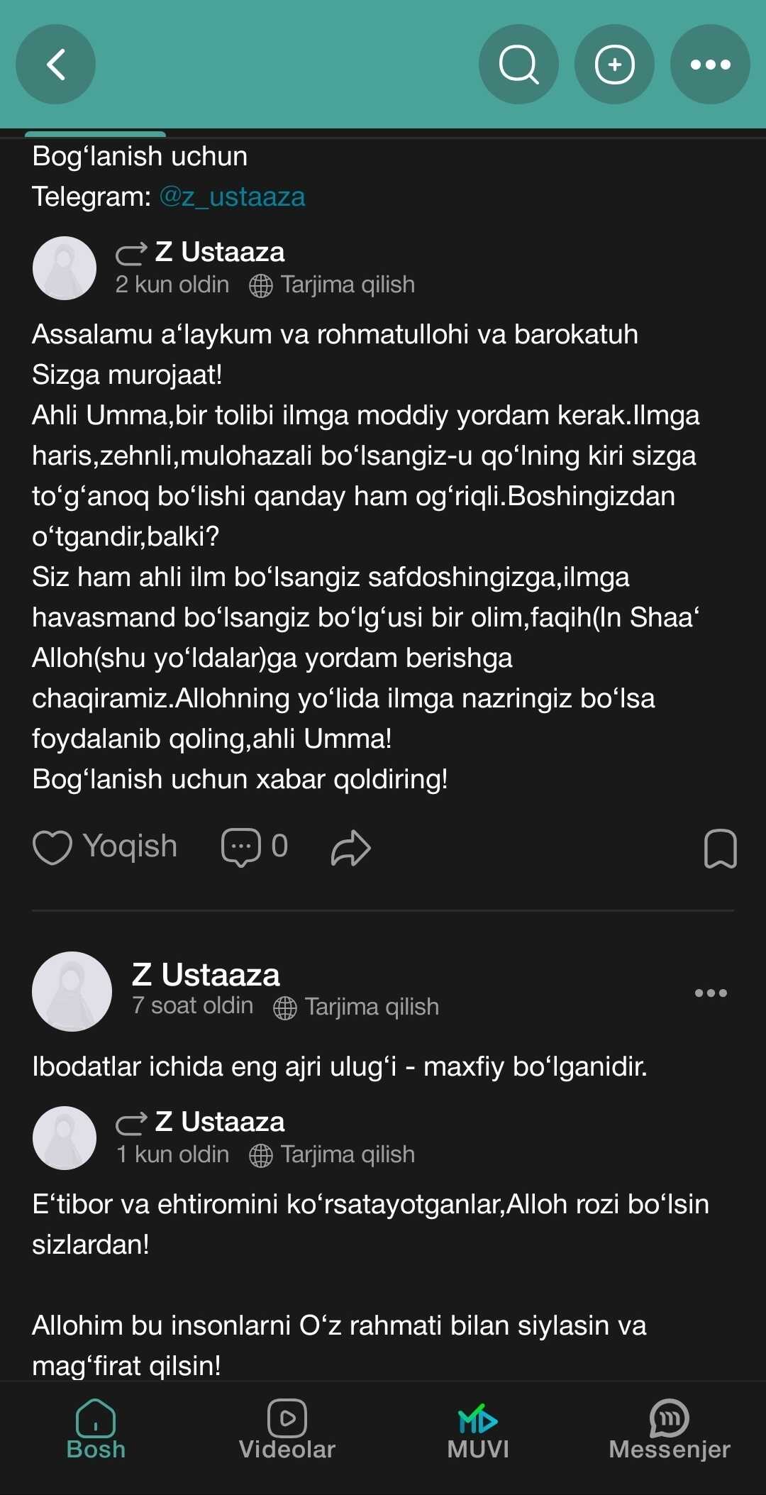 Siz ham ahli ilm bo‘lsangiz safdoshingizga,ilmga havasmand bo‘lsangiz bo‘lg‘usi bir olim,faqih(In Shaa‘ Alloh(shu yo‘ldalar)ga yordam berishga chaqiramiz.Allohning yo‘lida ilmga nazringiz bo‘lsa foydalanib qoling,ahli Umma!