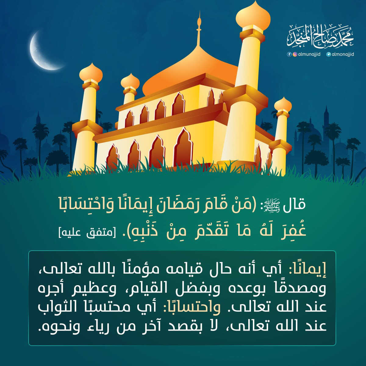• «مَن قام رمضان إيمانًا واحتِسابًا، غُفِر له ما تَقَدَّم من ذَنبِه».